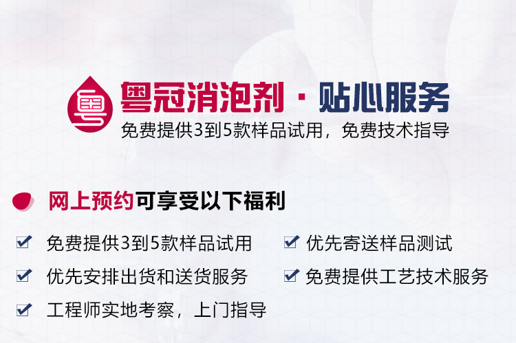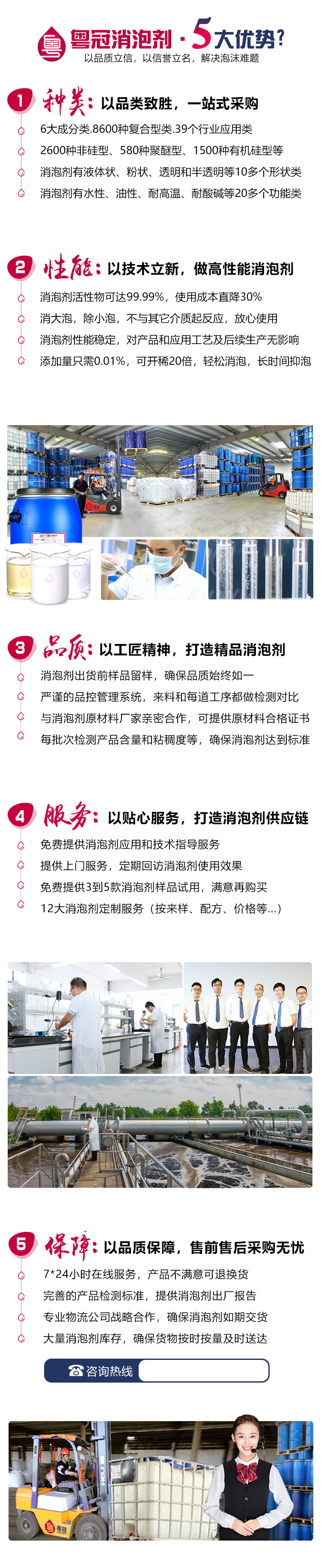 粵冠消泡劑產(chǎn)品廣泛應(yīng)用于水處理、切削液、工業(yè)清洗、印染、造紙、涂料、粘合劑,生物發(fā)酵、電廠脫硫、石油開(kāi)采等38個(gè)行業(yè)領(lǐng)域,有消泡解決方案3000多種類型。產(chǎn)品有有機(jī)硅類,聚醚類,礦物油類,高碳醇類,脂肪酸類,有單體,有復(fù)合體,有透明的,有淡黃的,有乳白的各種類型消泡劑,實(shí)現(xiàn)一站式采購(gòu)。